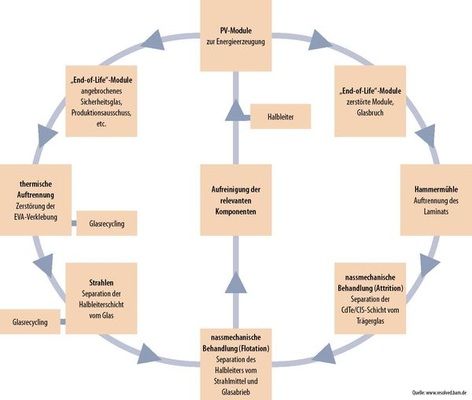 Das Konzept basiert auf einem nassmechanischen Prozess, der mit wenig Energie und wenig Chemikalien auskommt. Dabei wird zwischen alten Modulen mit noch intaktem Verbund und Modulbruch unterschieden. Der Kreislauf besteht aus vier Schritten: Schritt 1 ist die Zerlegung und Isolierung der Zelle mit Halbleitersubstrat. Ganze Module werden thermisch in die Halbleiter beschichtete Trägerplatte und das Deckglas aufgetrennt. Modulbruch wird in einer Hammermühle zerkleinert. Schritt 2 trennt die Zellschicht vom Substrat. Bei intakten Modulen wird die Halbleiterschicht vom Träger im Vakuum abgestrahlt. Beim zerkleinerten Modulbruch löst sich die Schicht in speziellen Mischern über Reib- und Scherkräfte.