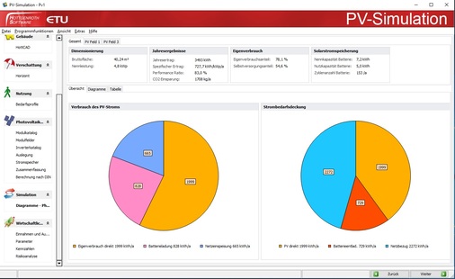 Neben der umfangreichen Herstellerdatenbank lassen sich eigene Daten hinzufügen. Für jede gewählte Kombination von Modul und Wechselrichter ermittelt das Programm Verschaltungsmöglichkeiten und führt in einer Gegenüberstellung Varianten auf. Die optimale Verschaltung wird anhand von verschiedenen Leistungsdaten bewertet. Batteriespeicher können optional berücksichtigt und simuliert werden. Ausgegeben werden u.a. Jahresertrag, Eigenverbrauch, detaillierte Diagramme zu den Klimadaten sowie den entsprechenden Strahlungsdaten, der Stromerzeugung, der Stromverteilung und dem Ladezustand der Batterie.