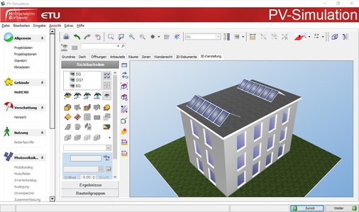 Das Vorgehen: nach Anlegen eines Projektes wird die einfache Gebäudeerfassung gewählt. So können die Maße aus Digitales Foto-Aufmaß eingegeben werden. Mittels vereinfachter Betrachtung wird die Anlage auf Grundlage relevanter Kennwerte ausgelegt. Alternativ kann eine komplette Dachplanung in 3D durchgeführt werden. Verschattungsberechnungen des Gebäudes und Meteonorm-Klimadaten sind inkludiert.