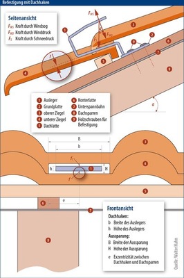 Durch die exzentrische Montage wird die Verformung der Konterlatte zu einer noch größeren Absenkung des Dachhaken-Auslegers führen als berechnet. Deshalb sollten für den exzentrischen Einbau beim Hersteller geeignete Stützelemente für die seitliche Unterstützung der Dachhaken-Grundplatte im Angebot sein, wie sie das Foto oben zeigt.