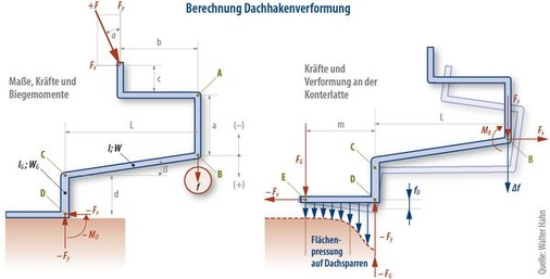 Bei dieser Millimeterarbeit ist klar, dass sich die Antwort auf die zweite Frage, ob es zur riskanten Ziegelberührung kommt, nur mit einer detaillierten Rechnung beantworten lässt (siehe Herleitung im Kasten Seite 74). Dabei zeigt sich, dass sehr wohl berechnet werden kann,wie weit sich der Ausleger des Dachhakens dem Ziegel annähert. Außer dem Elastizitätsmodul, der das Material des Dachhakens beschreibt, spielen nur die Geometrie des Dachhakens und die Verformbarkeit der Konterlatte eine Rolle.