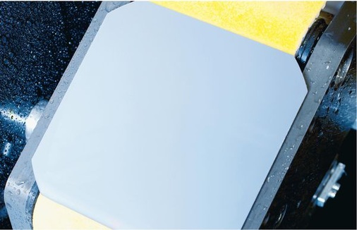 Auch im besten Fall bleibt ein Slurryrest zurück, der nach der Reinigung auch noch mit Wasser und Chemikalien durchsetzt ist. Dieses Gemisch sorgt nicht nur für vergleichsweise schmutzige Arbeitsbedingungen. Es erschwert auch das schadlose Vereinzeln. Per Hand schaffen das nur geschickte Werker, ohne die Bruchrate ins Astronomische zu treiben. Bei den Wafern mit 125 Millimeter Seitenlänge liegt sie dann durchschnittlich bei wenigen Prozent. Das erklärt, warum in der Rohwafer-Produktion immer noch oft per Hand vereinzelt wird.