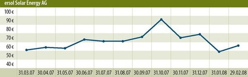 Dennoch setzen immer mehr Unternehmen auf diese siliziumfreie Technologie. Etwa der Erfurter Solarkonzern Ersol Solar Energy. Der hatte im Februar für 2007 zwar unterdurchschnittliche Zuwächse beim Umsatz (plus 25 Prozent) und EBIT (plus 10,1 Prozent) gemeldet. Ersol kündigte jedoch für 2008 einen verdoppelten Umsatz, einen vervierfachten Gewinn und ein weiteres Wachstum an. Die Ersol-Aktie hatte danach kräftig zugelegt und einen Großteil der zuvor erlittenen Kursabschläge wieder aufgeholt. Stephan Wulf von Sal. Oppenheim sieht diese Pläne durch das 2008 noch stabile Marktumfeld gedeckt. Er bewertet auch den Ausbau von Ersol zu einem zunehmend integrierten Solarkonzern mit eigener Wafer-, Zell- und Modulproduktion positiv. Außerdem stelle sich das Unternehmen derzeit vielversprechend in dem Bereich Dünnschichttechnologie auf (s. Seite 52). Bei der Umstellung von einer Pilot- auf die Massenproduktion hatte das Unternehmen hier jedoch mit Problemen zu kämpfen. Es hängt daher laut Sebastian Zank bei der Produktion von Dünnschichtmodulen der Konkurrenz hinterher. Die Erfurter seien erst dabei, hier Marktreife zu erlangen. „Es fällt dem Unternehmen schwer, die Dünnschichtproduktion zum Laufen zu bringen“, stellt auch von Blumenthal fest. Beide Experten gehen davon aus, dass sich die Solarbranche in den nächsten Jahren konsolidieren wird. Aufgrund der eher geringen Größe sei Ersol da ein Übernahmekandidat. Zumal der Ventizz Capital Fund II Mehrheitsaktionär des Unternehmens ist. Und solche Wagniskapitalgeber legen es letztlich darauf an, ihre Beteiligungen zu verkaufen.