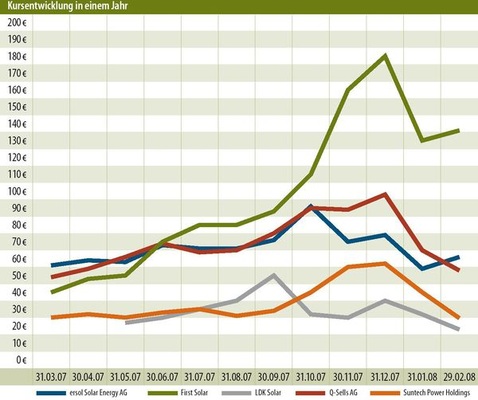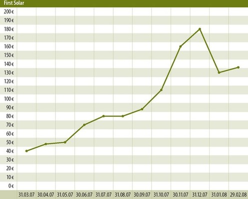 Von der Siliziumproblematik unberührt ist die US-amerikanische First Solar aus Phoenix, Arizona. Sie produziert Dünnschicht-Module auf Basis von Cadmium-Tellurium-Halbleitern, die zwar nicht so effizient sind wie bei Silizium-Zellen. Die Produktionskosten sind jedoch um fast 50 Prozent geringer, auch können sie bei verschiedenen Temperatur- und Lichtverhältnissen eingesetzt werden. „Das Unternehmen verfügt als Einziges über eine industrielle Massenproduktion von Dünnschicht-Modulen und besitzt hier quasi eine Monopolstellung“, sagt SES-Experte von Blumenthal. Das verleihe ihm eine enorme Gewinn dynamik mit einem binnen kurzer Zeit verzehnfachten EBIT. Diese machte First Solar 2007 zum Börsenstar unter den Solarwerten. Deren Aktienkurs hatte sich nach dem Börsendebüt gegen Ende 2006 fast verzehnfacht, bevor er 2008 einbrach auf das Siebenfache des Startniveaus. Mit der Vorlage der Zahlen für das IV. Quartal stabilisierte sich der Wert des Anteilsscheins. Mit einem Kurs um 140 Euro und einem Kurs-Gewinn-Verhältnis von über 80 ist er „sehr hoch bewertet“, findet von Blumenthal. Auch die Zahlen sind beeindruckend: Der Quartalumsatz wurde von First Solar vervierfacht, bei fast verachtfachtem Nettoerlös. Der Umsatz im Gesamtjahr stieg um über 300 Prozent, der Nettoerlös wurde vervierzigfacht von 4 Millionen auf 158 Millionen Dollar. Die Produktion an den Standorten in Ohio, in Deutschland und bald auch in Malaysia soll bis 2009 auf ein Gigawatt anwachsen, bei weiter fallenden Produktionskosten.