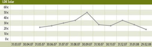 Die Solarwaferproduzentin aus Xinyu zählt unter anderem Q-Cells zu ihren Kunden. Sie wird vom Milliardär Xiafong Peng geführt, einem der reichsten Chinesen, und wurde von ihm im letzten Sommer an die Börse gebracht. Ihr war es Ende Februar sogar gelungen, mit einem Umsatzanstieg von über 200 Prozent und einem Gewinnzuwachs von 119 Prozent im Gesamtjahr sowie starken Zahlen für das IV. Quartal die Erwartungen der meisten Analysten zu übertreffen. Dennoch setzte sich auch der Preisverfall ihrer Aktie fort. Die US-Analystin Cheryl Tang von Goldman Sachs befürchtet, dass LDK Solar durch anhaltend hohe Siliziumpreise in 2008 und 2009 Gewinneinbußen erleiden wird. Denn das Unternehmen könne die hohen Ausgaben kaum an seine Kunden weitergeben, da es Lieferverträge mit Festpreisen eingegangen sei. Die Aktie der LDK ist aber wohl vor allem deshalb auf ihren Ausgabepreis und damit um 200 Prozent von ihrem Höchstwert zurückgefallen, weil sich die Zweifel an ihrer Bilanzierung der Siliziumreserven mehren. Etliche Analysten haben nach der Präsentation der Geschäftszahlen erklärt, diese Bilanzierung nicht nachvollziehen zu können.