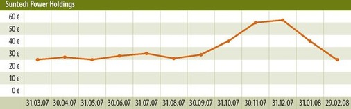 Hohe Margen haben auch für die chinesische Suntech Power oberste Priorität. Das Solarunternehmen aus Wuxi will 2008 Q-Cells als größten Solarzellenhersteller der Welt ablösen. Wie die Deutschen hatten auch die Chinesen in den letzten Jahren spektakuläre Zuwächse erzielt, die Erwartungen der Börsianer regelmäßig übertroffen, weshalb der Kurs der fast zeitgleich börsennotierten Suntech-Aktie rund 250 Prozent zulegte. Aber auch deren Anteilsschein stürzte 2008 massiv ab. Und obwohl das Unternehmen ebenfalls im Februar einen verdoppelten Jahresumsatz und einen Gewinnanstieg um rund 50 Prozent meldete, setzte sich die Talfahrt fort. Zum einen hatten die Aktionäre auch von Suntech noch mehr Zuwachs erwartet, zum anderen reagierten sie verschreckt auf die gesenkte Umsatzprognose. Das Unternehmen hatte im Februar einen Umsatzeinbruch in Höhe von 20 Millionen Dollar durch die Schneesturmschäden in China erlitten. Vor allem jedoch entschied sich die Führung von Suntech, den Ausbau der Produktion weniger zu beschleunigen als ursprünglich geplant. Denn sie hofft auf ein Absinken des Siliziumpreises.
