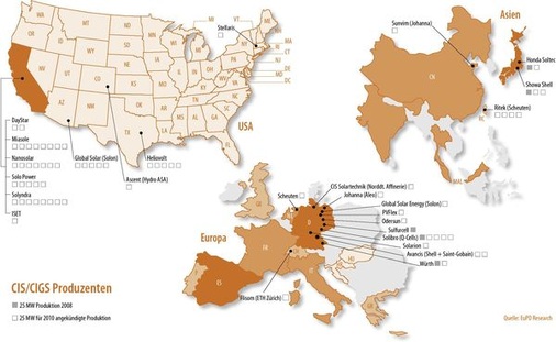Der Oberbegriff CIS bezeichnet Halbleiter, die statt aus Silizium aus einer Verbindung von Kupfer, Indium, wahlweise Selen oder Schwefel und einigen weiteren Elementen bestehen. Die Produzenten der Solarzellen aus diesem Material werben gerne mit drei großen Vorteilen. Mit der Ästhetik – die Module sindtief schwarz und optisch attraktiv. Mit dem hohen Wirkungsgrad, der damit im Prinzip möglich ist. Und damit, dass CIS-Zellen wie amorphe Siliziumzellen und Cadmium-Telluridzellen in Dünnschichtverfahren hergestellt werden und deshalb preiswert in der Produktion sein sollen (siehe Spezial Dünnschicht, photovoltaik 04/2008). Doch was in der Theorie unbestritten ist, scheint in der Praxis noch Probleme zu machen, sonst wäre CIS nicht so ins Hintertreffen geraten, wie es der Vergleich zeigt: Ende 2008 bestand laut Angaben des Marktforschungsinstituts EuPD Research für amorphe Siliziumzellen bereits eine Produktionskapazität für Zellen mit einer Leistung von 2,2 Gigawatt. Anders die Situation bei CIS: „Bisher lassen sich die Firmen mit kommerzieller Massenproduktion an einer Hand abzählen“, sagt Stephan Franz, der bei EuPD Research den Dünnschichtmarkt analysiert. In seiner Grafik tauchen momentan nur Würth Solar, das eng mit dem Stuttgarter Zentrum für Sonnenenergie und Wasserstoffforschung (ZSW) zusammenarbeitet und als erste Firma bereits 2006 die CIS-Serienfertigung aufgenommen hat, Honda Soltec, Solibro, eine Q-Cells-Tochter, Showa Shell und Sulfurcell mit signifikanten Mengen auf. Zusammen dürften es weniger als 150 Megawatt sein. Was sind also die Chancen der CIS-Technologie?