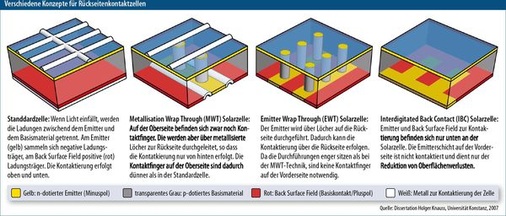 „Rückkontakt-Solarzellen sind eine Familie aus verschiedenen Konstruktionstypen. Gemeinsam ist ihnen, dass man die beiden Kontakte, also den positiven und den negativen, auf der Rückseite der Zelle unterbringt“, erläutert Ralf Preu, der sich am Fraunhofer-Institut für Solare Energiesysteme (ISE) in Freiburg mit dieser Technologie beschäftigt. Er unterscheidet drei verschiedene Ausführungen (siehe Grafik Seite 61).
