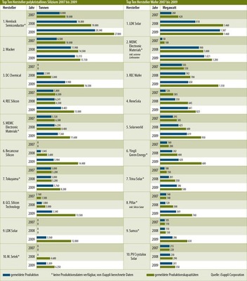 Die Produktion von Wafern beeinflusst die Branche nicht so stark. Solche Kapazitäten können schneller aufgebaut werden, wenn es einen Engpass gibt. Die Zellhersteller ordern ihre Ausgangsmaterialien sowohl bei den Waferproduzenten als auch direkt bei den Siliziumherstellern, um die Wafer dann selbst zu produzieren. MEMC Electronic Materials verkauft zum Beispiel sowohl Silizium als auch Wafer. Das sollte bei den Rankingergebnissen beachtet werden. Eine Handvoll Waferproduzenten hat in der Vergangenheit dennoch das Marktgeschehen bestimmt und sehr gute Gewinne erzielt. „The Big Five“, das sind LDK, MEMC, REC, Renesola und Solarworld. „Die expandieren auch alle weiter“, sagt Stefan de Haan von iSuppli. „Sie profitieren ganz klar von ihren Skaleneffekten, haben sehr günstige Kostenstrukturen und konzentrieren sich momentan durch die Bank darauf, etwas weniger in die Kapazitätsausweitung zu investieren und stattdessen die Kosten weiter zu senken – ihre Antwort auf den Nachfrageeinbruch.“