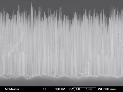 Als Substrat dient anders als bei konventionellen Galliumarsenidzellen eine Siliziumscheibe. „Das macht die Nanodrahtzellen billiger, denn Galliumarsenid-Dünnschichtzellen brauchen in derRegel teures Germanium als Basis“, sagt Ray LaPierre. In der Produktion bringt er erst nanometerkleine Goldtröpfchen auf die Siliziumscheibe. Dann verdampft er wie bei der Herstellung von konventionellen Galliumarsenidzellen gallium- und arsenhaltige Verbindungen. Der Dampf löst sich im Gold, schlüpft quasi hindurch und scheidet sich unter der Kugel als Galliumarsenid ab. Schicht für Schicht wachsen so säulenartige Kristalle, auf denen die Goldkugeln thronen wie Kirchenkuppeln. Diese werden zum Schluss abgeschliffen, so dass die Galliumarseniddrähte frei stehen. Sie versieht der Forscher mit einer Schicht aus durchsichtigem, elektrisch leitfähigem Indiumzinn- oder Zinkoxid. Wie bei Dünnschichtzellen wird zum Schluss noch ein Metallgitter auf das Oxid gedampft, um den elektrischen Vorderseitenkontakt herzustellen. Der Rückkontakt wird über das Siliziumsubstrat geschlossen.