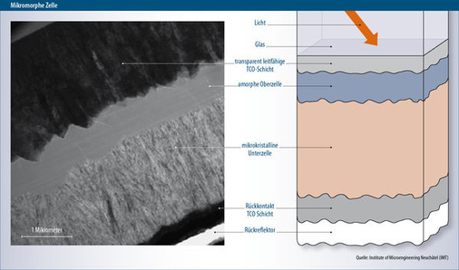 „Ich sehe noch Spielraum für Verbesserungen“, sagt Johannes Meier. Nach seinen Angaben erreichen kleinere Labormodule bereits mehr als zehn Prozent Wirkungsgrad. Meier deutet auch die weitere Marschrichtung des Schweizer Fabrikausstatters an: „In einer Tandemzelle könnte ein Interlayer die Lichtausbeute verbessern.“ Als Interlayer bezeichnet er eine Zwischenschicht zwischen der oberen, amorphen Zelle und der unteren, mikrokristallinen Schicht. Oerlikon Solar experimentiert mit Zinkoxid, auch als TCO bekannt, zwischen Glas und amorpher Schicht. TCO steht für die transparente leitfähige Schicht, die als obere Elektrode fungiert. Der Interlayer senkt die Lichtverluste am Übergang vom amorphen zum mikrokristallinen Silizium. Denn wie an jeder Grenzfläche treten dort unerwünschte Reflexionen auf. Tests zeigten, dass der Interlayer vor allem die Ausbeute der oberen Siliziumschicht verbessert. Offenbar wirkt er zugleich wie ein Spiegel, der einen Teil des Lichts auf die Oberzelle zurückwirft.