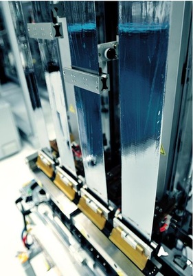 „Den Einsatz der Säuren zu verringern, ist einer unserer Schwerpunkte in der Zellfertigung“, erläutert Holger Hoppe, Konzernbeauftragter für das Umweltmanagement bei Schott Solar. Schott Solar will dieses Ziel durch längere Standzeit der Ätzbäder und die verringerte Konzentration in den Bädern erreichen. Auf diese Weise sinkt auch der Aufwand, um den Abfall zu neutralisieren. Denn erst wenn die Chemikalien nicht mehr reaktiv sind, darf man das Abwasser entsorgen. Polykristalline Wafer werden mit Salpeter- und Flusssäure geätzt. Bei monokristallinen Wafern setzt man alkalische Ätzmittel ein, wie Natriumhydroxid, Kalilauge. Als Reinigungsmittel dient Isopropanol. Wieder drückt das Problem der mangelnden Ausbeute: Denn beispielsweise die Ätzung der monokristallinen Wafer nutzt die giftige Lauge nur zu zwei Prozent aus. 98 Prozent gehen in die teure Nachbehandlung, sprich: Neutralisation und Filterung.