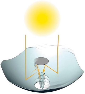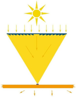 • Die Konzentratoren der texanischen Entech arbeiten nach einem völlig anderen, wesentlich größer dimensionierten Prinzip: Die Zellen werden in der Fokussierungsebene von mehreren Meter langen Halbröhren montiert. Der Konzentrationsgrad ist im Gegensatz zu den vorher beschriebenen Systemen lediglich zwanzigfach.