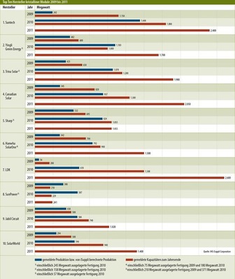 Die Konjunktur brummt, die Wirtschaftsleistung in China ist allein im zweiten Quartal 2011 um 9,6 Prozent gewachsen. Suntech dagegen hat seine Modulproduktion von 2009 zu 2010 sogar versechsfacht. Andere chinesische Modulproduzenten wachsen ebensorasant: So führen gleich vier von ihnen die Top Ten der größten Modulhersteller an.