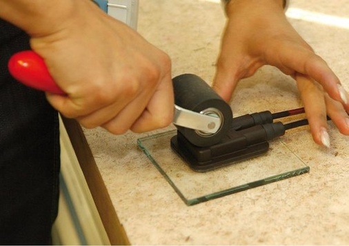 Es folgt die Vorführung der Befestigung einer Anschlussdose, die mit einem Pad aus Solar Acrylic Foam Tape versehen ist, auf einer Glasoberfläche. Eine Labormitarbeiterin zieht die Schutzfolie ab und drückt sie per Hand auf das Glasmuster. Sie setzt einen Abroller auf die Rückseite der Kunststoffdose und verstärkt so für mindestens fünf Sekunden den Druck. Schon kurz danach schafft es Matthias Annas aus der Renewable-Energy-Entwicklungsabteilung von 3M in Neuss nicht mehr, die Dose vom Glas zu trennen. Dass sie streifenfrei verklebt ist, beweist ein Blick durch das Glas auf die verklebte Dosenunterseite.