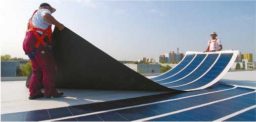 Das Potenzial für die leichten Modulbahnen ist dementsprechend groß. Insgesamt werden Jahr für Jahr in Europa Flachdächer mit 500 Millionen Quadratmetern neu eingedeckt. Mit rund 90 Millionen Quadratmetern stellt Deutschland den größten Anteil. Die Plätze zwei und drei belegen Frankreich und Großbritannien mit etwa 70 Millionen Quadratmetern. Das zeigt eine Potenzialstudie, die Parabel 2009 in Auftrag gegeben hat. Von den in Deutschland neu gebauten Dächern sind immerhin knapp die Hälfte Leichtdächer, die keine schwere Last tragen können. Doch nicht nur die neu gebauten Dächer sind interessant, die nur ein Viertel der neu eingedeckten Dächer ausmachen. Den größeren Anteil haben Sanierungen bestehender Dächer. „Wennwir nur diese Dächer nehmen, kommen wir auf ein Potenzial von zwei Gigawatt pro Jahr allein in Deutschland“, sagt Tobias Huschke. Er sieht in den flexiblen Modulen das Kerngeschäft der Zukunft: „Die Nische ist mir groß genug.“ Um die Module leicht zu halten, laminiert Noch-Monopolist Unisolar die Dünnschichtzellen zwischen zwei Kunststoffschichten ein, die sie vor Feuchtigkeit und Schmutz schützen sollen. Als schmale Bahnen von zwei bis sechs Metern Länge werden die Module bei den Partnerfirmen auf Dachbahnen integriert. Der Dachdecker verlegt diese wie eine gewöhnliche Dachhaut, mit einem Aufwand, den er bei der Sanierung sowieso hat. Lediglich das Verlegen der Kabelkanäle und die elektrische Verschaltung kommen hinzu. Außer auf Dachbahnen montieren einige der Partnerfirmen, wie Centrosolar, die Module auch auf gekanteten Metallaufständerungen mit kleinen Neigungswinkeln.