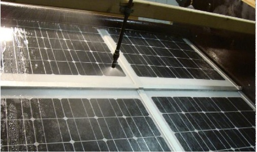 Das Gebläse heult, Wasser strömt über die gläserne Oberfläche der drei übereinander installierten Module. Durch einen Acrylglaskasten schauen die Ingenieure gespannt auf die Unterseite des simulierten Dachaufbaus. Je länger sich hier kein Tropfen Wasser blicken lässt, umso besser schneidet das System im Test ab. Denn die Forscher befinden sich in einem Versuchslabor an der Technischen Universität Berlin des Fachgebietes Bauphysik und Baukonstruktionen. Auf dem Prüfstand steht das neue Indachsystem MVL², das der Montagesystemhersteller Mecosun in Kooperation mit dem Modulproduzenten Sanyo entwickelt hat und das bei Sanyo „Hit Power Roof“ heißen wird.
