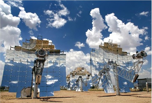 Diese Kombination aus einem Solarkollektor und einem Stirling-Motor nennt man Dish-Stirling-Anlage. Ein schüsselförmiger Spiegel bündelt das Sonnenlicht auf einen Wärmeabsorber am Motor, der an einem Träger oberhalb des Kollektors hängt. Die gesamte Anlage ist auf ein Gestell montiert, das der Sonne nachgeführt werden muss.