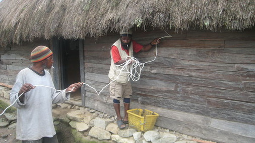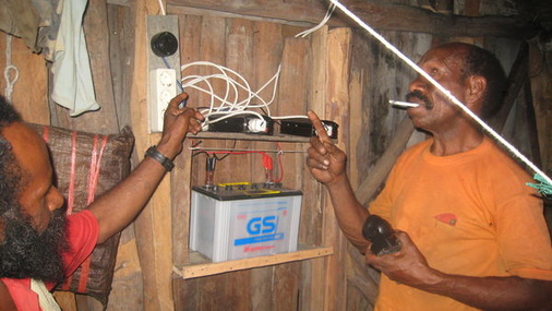 „Letztes Jahr hat mir ein Bekannter aus einem anderen Dorf erzählt, dass er so eine Solaranlage hat. Die hat er im Supermarkt in Wamena gekauft.“ Wamena ist die einzige Stadt im Baliental, lediglich durch Flugverkehr mit der globalen Warenwelt verbunden. Um von Kilise in das 50 Kilometer entfernte Städtchen zu gelangen, braucht der 39-jährige Elopore fast einen ganzen Tag, erst zu Fuß, dann mit verschiedenen Sammeltaxis, die immer wieder an reißenden Bächen mit weggespülten Brücken enden. Mit rund sieben Millionen Rupien im Gepäck, das sind 600 Euro, kaufte er dort im vergangenen Jahr seine Solaranlage: Ein 54-Watt-Modul, einen Laderegler, eine Autobatterie und dazu zwei Wechselrichter. Voller Stolz ließ er die Anlage von seinem Bekannten installieren. Und alles funktionierte auch, zwei Monate lang.