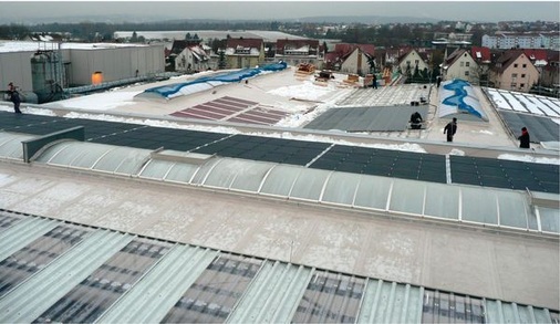 Diese Dachabdichtung aus flexiblen Polyoelfinen (FPO) liefert das Unternehmen nicht nur für neue Flachdächer und Dachsanierungen zu, sondern auch an die Photovoltaikbranche. Hersteller wie Q-Cells oder Solar Integrated laminieren Dünnschichtzellen darauf und vertreiben die Bahnen anschließend als Dünnschichtsysteme für Gewerbe- und Industriedächer.So kam Diegelmann auf die Idee, das zu tun, was seine Photovoltaikkunden den Besitzern großer Dachflächen oder Investoren raten: im Zuge der Sanierung doch gleich eine Photovoltaikanlage mitzubauen. Seine Unternehmensleitung konnte er von den Vorteilen einer eigenen Vorführanlage schnell überzeugen. Wenn Interessenten auf dem Werkdach sehen, was an Photovoltaiklösungen möglich ist, entscheiden sie sich eher für eine dieser Anlagen. Bestellen sie dabei gleich auch noch Sika-Dachbahnen, umso besser für daseigene Geschäft.