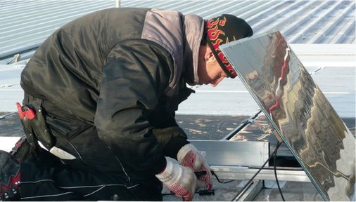 Angeliefert wurden auch diese Module in Holzkisten. Die Monteure platzierten das erste Modul auf vier Füßen. Das zweite Modul hängten sie daran an. An dieses montierten sie wiederum zwei Füße und hängten das nächste Modul ein. Einhängen, festschrauben, einhängen, festschrauben: So ging es weiter, bis die Anlage komplett war.Trotz der nur lockeren schnellen Befestigung soll das Modul gut halten. Da der Wind durch die Röhren hindurchpfeift, bieten sie nur eine geringe Angriffsfläche.Um eine optimale Reflexion der Solarstrahlung vom Untergrund zu erhalten, empfiehlt der Hersteller einen Abstand der Module von etwa 30 Zentimeter zum Boden. Das System interessiert Bernd Diegelmann, weil er darin eine neue Einsatzmöglichkeit für seine Dachbahnen sieht und ihre Wirkung testen will. Unter dieser Anlage ließ er zusätzlich zu dem beigefarbenen Kunststoffuntergrund weiße Dachbahnen verlegen. In den kommenden Jahren will er die durch die Farbe bedingten unterschiedlichen Erträge messen und auswerten. Bei der Standardfarbe Beige beträgt die Reflexion 64Prozent, für die weißen Bahnen kann Diegelmann es noch nicht sagen. Von der schnellen Montage der Solyndra-Module waren alle Beteiligten begeistert. „Wir haben etwa ein Viertel der sonst üblichen Montagezeit benötigt“, freut sich Tobias Ruof, Projektleiter bei Pohlen Solar. Den Vergleich zieht er zu herkömmlichen kristallinen Anlagen und Dachbahnen. Für die 22-Kilowatt-Anlage benötigten seine vier Monteure nur zehn Stunden. „Sie mussten das System erst einmal kennen lernen, aber dann wurden sie immer schneller“, sagt Ruof. Hochspannend – beeindruckend – faszinierend, mit diesen Worten beschreiben die Beteiligten ihren Eindruck von der Installation. Gleichwohl bleiben sie abwartend. Denn der zusätzliche Ertrag von 70 Prozent im Vergleich zu herkömmlichen Anlagen, den Solyndra prognostiziert, hängt zu einem wesentlichen Teil von der Reflexion vom Boden ab. Durch Regen, Schnee, Staub und andere Einflüsse verändern sich Dachbahnen aber im Laufe der Jahre, so dass die Reflexion nicht stabil bleibt. „Das wollen wir untersuchen und sehen, was wir tun können“, kündigt Ruof an. Zum Beispiel wollen er und Diegelmann prüfen, ob es für Betreiber sinnvoll sein könnte, den Untergrund hin und wieder zu reinigen, und wie dies am besten geschehen könnte. Neben der schnellen Montage nennt Ruof als weiteren Systemvorteil das geringe Gewicht. Es beträgt bei diesem Anlagentyp nur 16 bis 17 Kilogramm je Quadratmeter. Beide Vorteile schlagen sich, wie zu erwarten, im Preis nieder, zu dem sich Ruof bedeckt hält. „Sie sind ein bisschen billiger als kristalline Module und teurer als CIS-Module.“ Seine Firma stehe noch mit dem Hersteller Solyndra inVerhandlung, deswegen könne und wolle er nicht mehr sagen. Die Preise für die vier Anlagen bleiben also vage. Bernd Diegelmann verrät nur, dass sein Unternehmen insgesamt rund 300.000 Euro in die Vorführanlage investiert hat. Mit der ersten Resonanz ist er zufrieden. Mehrere Architekten und Dachdecker zeigten bereits Interesse, die vier Anlagen in Augenschein zu nehmen. Ebenso ein führender Discounter. Doch sie alle müssen noch warten. Anfang des Jahres lagen 20 Zentimeter Schnee auf dem Dach. Offiziell eröffnet die Anlage im März.