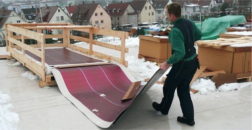 Mit dem Dachabdichter Dachland, der eine eigene Photovoltaiksparte unterhält, arbeitet Sika seit vielen Jahren zusammen. Sika-Verkaufsleiter Bernd Diegelmann und Norbert Nehues, Leiter der Abteilung Photovoltaik bei Dachland, haben die Vorführanlage gemeinsam geplant. Zunächst entschieden sie sich für zwei Typen von Dünnschichtbahnen.Mit dem Modul Flexcell bauten sie eine Prototypenanlage. Das Schweizer Unternehmen VHF-Technologies (Flexcell) stellt dieses flexible, sehr dünne Photovoltaikmodul her. Bei Flexcell werden mit einer Hochfrequenz-Plasmatechnologie Schichten aus amorphem Silizium auf Kunststoffträger aufgetragen, in diesem Fall Sarnafil-Bahnen. Die Siliziumschichten sind nur 0,3 Nanometer dünn. Die biegbaren Flexcell-Produkte wurden bisher in Bereichen wie Camping und Outdoor, auf Booten und Yachten sowie in Kleinelektronik wie Handys und Kameras eingesetzt. Neu ist der Flexcell-Typ FLX-TO200 für Flachdächer, von dem Sika Bahnen mit sechs Kilowatt Leistung erhielt.Ebenfalls um Dünnschichtbahnen mit dem Kunststoffuntergrund Sarnafil handelt es sich bei den flexiblen Modulen mit 4,6 Kilowatt Spitzenleistung, die Sika von Solar Integrated(SIT) bezog. Im Gegensatz zu den einlagigen Schichten bei Flexcell enthalten diese Module amorphe Triple-Junction-Zellen. „In der Montage gibt es keinen großen Unterschied“, sagt Nehues. Er koordinierte die Arbeit von vier Dachland-Monteuren. Die kürzeren Flexcell-Module wurden aufeinandergeschichtet in Holzkisten angeliefert, die SIT-Dachbahnen kamen aufgerollt. Die Monteure legten die Bahnen an ihren Platz und begannen mit speziellen Automaten das thermische Schweißen. Auf dem Stuttgarter Dach schweißten sie zwei Kunststoffschichten zusammen. Die untere Dachabdichtung ist mechanisch an das Gebäude fixiert. Auf diesen Untergrund schweißten die Monteure die Kunststoffbahn des Photovoltaikmoduls. Anschließend verschalteten Elektriker die Anlage, indem sie die vormontierten Kabelanschlüsse verbanden. Zu guter Letzt schweißten sie die Kabelstränge mit passenden Kunststoffbändern auf die Dachhaut.