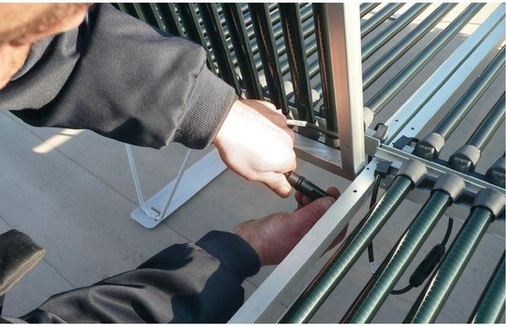 Deutlich günstiger als die dachintegrierten Photovoltaikbahnen ist der dritte Anlagentyp, den Dachland montierte. Hier fiel die Wahl auf eine 41-Kilowatt-Anlage des Systemanbieters Sunova aus dem bayerischen Grasbrunn. Die Anlage ist eine Kombination des Befestigungssystems MCG 1.0 von Sunova und kristallinen Glas-Glas-Laminaten des Typs Solibro. Zunächst legten die Monteure die Metallschienen, die in diesem Fall von Schletter stammen, an ihre Position. Danach verbanden sie die Schienen mit dem Kunststoffuntergrund. Hierfür nahmen die Monteure patentierte Folienhalter von Sunova. Sie übertragen die Sogkräfte des Windes auf die Kunststoffabdichtungsbahn. Diese leitet die Kräfte über ihre mechanische Fixierung in den Dachaufbau ein. Als die dachparallele Unterkonstruktion fertig montiert war, befestigten die Monteure die Glas-Glas-Laminate mit Klemmen darauf.Das System eignet sich für neu gebaute oder neu abgedichtete Flachdächer mit einer Neigung zwischen ein und zehn Grad. Als Untergrund für die Folienhalter empfiehlt Sunova Sarnafil-Dachbahnen – ein Grund, weshalb dieser Anlagentyp in Diegelmanns Konzept des Musterparks passt. „Das ist ein bewährtes, aufgeständertes System“, zieht Norbert Nehues zu diesem Anlagentyp Bilanz. Im Vergleich zu den extrem leichtenDachbahnen ist es allerdings schwerer. Sunova-Solibro wiegt etwa 25 Kilogramm je Quadratmeter. Damit zählt es allerdings immer noch zu den Systemen, die sich für Flachdächer eignen, da sie die DIN 1055 erfüllen. Diese Norm regelt die statische Belastung durch Wind und Schnee. Nachteil des Systems ist die aufwändige Montage. Doch diese wird durch den günstigeren Preis wieder wettgemacht. Wie bei den Dachbahnenanlagen mussten die Monteure ihre Arbeit auch hier wegen des Wetters mehrfach unterbrechen. Insgesamt war das Dachland-Team etwa drei Wochen mit den drei Anlagen mit 51,6 Kilowatt Gesamtleistung beschäftigt. „Bei besserem Wetter hätten wir zwei Wochen gebraucht“, sagt Nehues. Doch ob zwei oder drei Wochen, das Rennen um die kürzeste Montagezeit machte der vierte Anlagentyp. Das Dachabdichtungsunternehmen Pohlen installierte für die Firma Sika eine 22-Kilowatt-Anlage mit dem Modultyp Solyndra, der erst seit wenigen Monaten in Deutschland erhältlich ist (siehe auch Artikel Seite 56). Die Module des US-amerikanischen Herstellers Solyndra basieren auf der CIGS-Dünnschichttechnologie (Kupfer-Indium-Gallium-Diselenid). Das ist eine bewährte Technik, neu ist der Modulaufbau, der an Vakuumröhrenkollektoren erinnert. Ein Modul ist 1,82 Meter lang und 1,08 Meter breit. In dem Metallrahmen sind 40 Glasröhren befestigt, in denen sich jeweils rund 140miteinander verbundene zylindrische CIGS-Zellen befinden. Durch die transparenten Röhren nehmen die Dünnschichtzellen laut Hersteller direktes und indirektes Sonnenlicht von allen Seiten auf, also auch reflektierte Strahlen vom Untergrund.