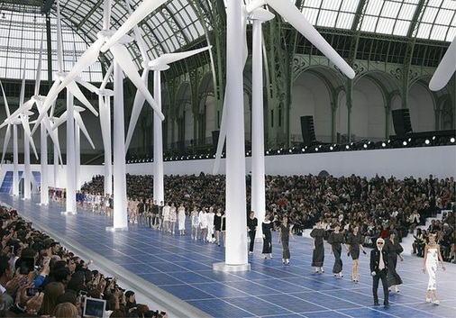 Wind und Sonne finden sich auch in Lagerfelds Entwürfen für die kommende Saison. Winzige seidene Windräder tauchen auf den Kleidern auf, die Muster zitieren das Design von Zellen und Modulen, strahlende Blautöne sorgen sowohl bei den Stoffen als auch beim Augen-Make-up für auffallende Akzente: „Electric Blue“ hat Lagerfeld seine Trendfarbe für den kommenden Sommer getauft. Der Designer gibt unumwunden zu, dass die Schönheit der tiefblauen Solarzellen ihm als Inspiration gedient habe. Und in diversen Interviews nach der Modenschau sprach Lagerfeld von der Faszination, die für ihn von den erneuerbaren Energien ausgeht. „Würde ich heute ein Haus bauen, würde ich auf solche Technologie zurückgreifen. Und wenn ich einen großen Park um das Haus herum hätte, würde ich mir eine ganze Allee von Windrädern hineinstellen. Das ist unsere Zeit. Und ich finde das hübsch.“