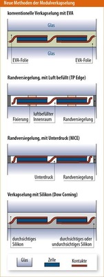Doch der EVA-Schicht droht nicht nur Konkurrenz von solchen folienlosen Ansätzen. Verschiedene Anbieter wie zum Beispiel Wacker arbeiten auch an Folien aus alternativen Materialien, die, wenn sie schon weiterhin laminiert werden müssen, zumindest eine bessere Barriere gegen Wasserdampf darstellen sollen. Und auch die Rückseitenfolie, die bislang von Duponts Tedlar dominiert wird, soll Konkurrenz von verschiedenen Alternativprodukten bekommen.