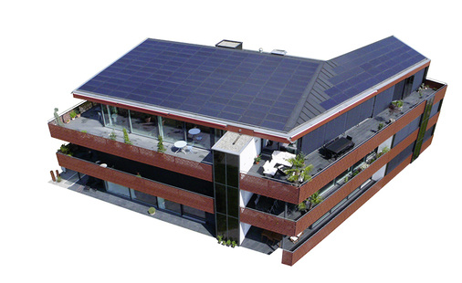 Mit dem Solardachsystem Megaslate der Firma Meyer Burger wurden die 14 Teilflächen des 119 Quadratmeter großen Daches bestückt. Das Solardach besteht aus 346 Standard- und 142 Spezialmodulen sowie 13 Systemdachfenstern. Die integrierte Anlage wird jährlich 70.000 Kilowattstunden Sonnenstrom produzieren. Eine ausgeklügelte Einzelhinterlüftung der Module ermöglicht auch an heißen Sommertagen höchste Energieerträge.