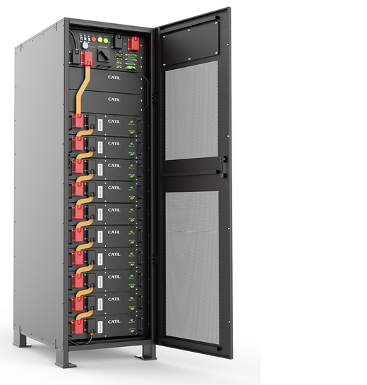 Die Racklösung des Herstellers Catl aus China kommt mit Lithium-Eisenphosphat-Zellen und liefert besonders schnell eine hohe Leistung. Die sogenannte High Power LFP Battery Solution mit Notstromfunktion ermöglicht einen Entladestrom mit einer C-Rate von 6C. Das entspricht einer vollständigen Entladung des Speichers in zehn Minuten.