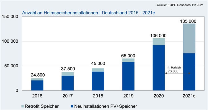 Diese gestiegene Anlagenleistung geht mit einem wachsenden Bedarf an ergänzenden Speichersystemen einher. Für das erste Halbjahr 2021 haben die Markt- und Wirtschaftsforscher von EUPD Research eine Marktgröße von 73.000 Heimspeicherinstallationen ermittelt. Im Vergleich zum ersten Halbjahr 2020 ergibt sich damit ein starkes Wachstum von 59 Prozent. Aufgrund von Lieferschwierigkeiten im Kontext der Corona-Pandemie prognostiziert EUPD Research im zweiten Halbjahr einen etwas schwächeren Markt, der sich dann auf insgesamt 135.000 Heimspeicher-Neuinstallationen in 2021 summiert.