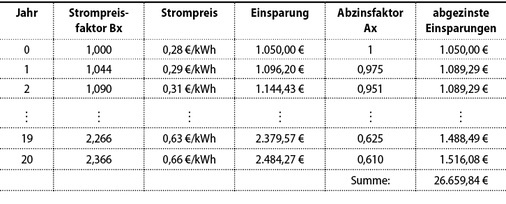 Bei einer Einsparung von 3.750 Kilowattstunden und einem Ausgangsstrompreis von 28 Cent je Kilowattstunde lassen sich für jedes Jahr die abgezinsten Einsparungen errechnen. Diese sind tabellarisch für 20 Jahre Laufzeit ausgewertet.