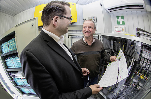 Die Leitung zwischen Windpark und Umspannwerk, wo der Strom von Mittel- auf Hochspannung von 110 Kilovolt transformiert wird, wurde geteilt. „Ein Abzweig läuft nun vom Umspannwerk über die neue Übergabestation mit 31,5 Kilovolt zum Batteriekraftwerk“, erklärt Netzel. Im Werk sind sieben Transformatoren, die die Spannung auf 400 Volt herunter transformieren. Einen weiteren Trafo gibt es für den eigenen Strombedarf des Kraftwerks. „Aufgrund einer neuen EU-Ökorichtlinie handelt sich dabei um besonders verlustarme ölfreie Trockentransformatoren“, sagt der Projektleiter.