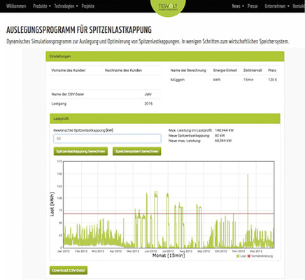 Der Konfigurator ermittelt den Bedarf des Kunden für die Kappung von Lastspitzen und berücksichtigt dabei auch Wünsche wie die Größe des Speichers oder die Flexibilität beim Be- und Entladen. Abweichungen zwischen der maßgeschneiderten Lösung und der wirtschaftlich sinnvollsten Variante lassen sich am Ende des Prozesses in einer Übersicht vergleichen. Das Tool ist gratis verfügbar, lediglich eine Registrierung ist nötig (die lässt sich aber sofort vornehmen). Danach lädt der Kunde sein Lastspitzenprofil hoch und gibt den Leistungspreis pro Kilowatt aus der Stromrechnung an, die er von seinem Energieversorger bekommt.