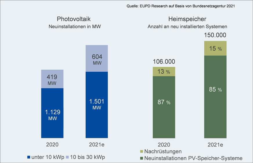 Ein sattes Wachstum von 42 Prozent prognostizieren die Analysten von EuPD Research für den Heimspeichermarkt in diesem Jahr. Das bedeutet konkret: Nach 106.000 Installationen im vergangenen Jahr werden 2021 rund 150.000 neue Heimspeicherinstallationen erwartet.
