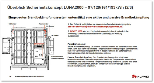 Die Batteriesicherheit steht bei Huawei besonders im Fokus. Jede Zelle wird einzeln überwacht und kann auf Modulebene isoliert werden. Zudem ist eine aktive Abschaltung möglich. Mehrere Detektoren überwachen das System auf eine Brandentwicklung, ein aktives Abluft- sowie ein Feuerlöschsystem sind im Gerät montiert. Wärme- und Rauchmelder der Batterieschränke können einen Alarm auslösen, wenn die ermittelte Temperatur über dem festgelegten Schwellenwert liegt oder wenn Rauch festgestellt wird.