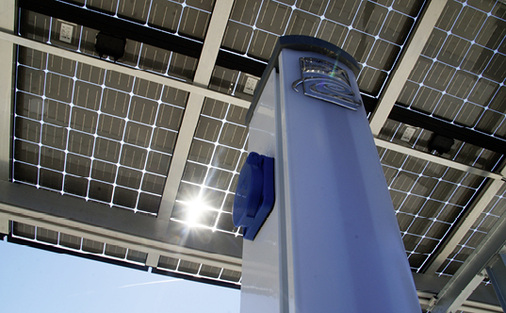 Jeweils seitlich befindet sich die LED-Statusanzeige. Ist die Station frei, leuchtet sie blau. Wird sie geladen, erscheint eine rote Anzeige. Ist der Ladevorgang beendet, leuchtet der Balken grün. Zudem kann die Säule in allen RAL-Farben beschichtet werden. Chromzierleisten können weitere Akzente setzen. Seitlich an der Säule befindet sich eine Schiene für Werbetafeln.