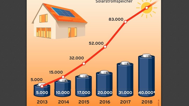 Nach regelmäßigen BSW-Erhebungen sind die Preise für schlüsselfertig installierte Solarstromspeicher in den letzten fünf Jahren um rund 60 Prozent gesunken. Inzwischen seien rund 120.000 Solarstromspeicher in Deutschland in Betrieb, 2018 kamen nach einer ersten Einschätzung des Verbandes 35.000 bis 40.000 neue Speicher hinzu.