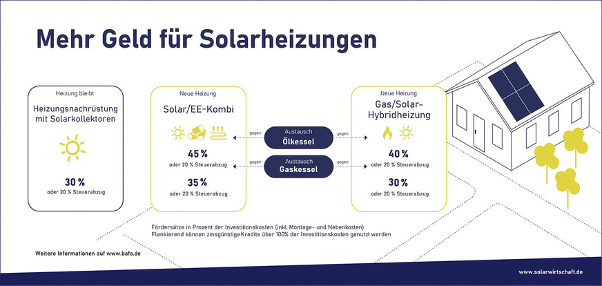 Seit Jahresbeginn gibt es mehr Geld für den Umstieg von Öl und Gas auf erneuerbare Energien, wenn die alte Heizung gegen eine Wärmepumpe oder eine Solaranlage ausgetauscht wird. Bis zu 35 Prozent gibt das Bundesamt für Wirtschaft und Ausfuhrkontrolle (Bafa) zu den Investitionskosten dazu, sowohl im Neubau als auch im Rahmen einer Modernisierung. Wenn eine Ölheizung ersetzt wird, übernimmt das Bafa sogar bis zu 45 Prozent der Investitionskosten. Mit dabei sind auch die teilweise Übernahme der Entsorgungskosten für die Altgeräte. Außerdem gibt es eine Unterstützung für den Einbau effizienter Flächenheizungen und für die Erschließung von Wärmequellen. Einen Überblick bietet das Merkblatt des Bafa: