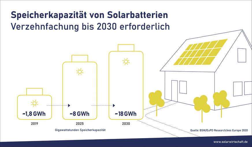In seinem Sieben-Punkte-Plan empfiehlt der BSW-Solar eine Verdoppelung des Ausbautempos im Jahr 2021 und eine Verdreifachung der jährlich installierten Solarleistung ab 2022. Die Kapazität der Batteriespeicher sei in den kommenden zehn Jahren gegenüber 2019 zu verzehnfachen, fordert der Branchenverband.