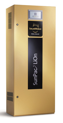 Der Sun Pac Lion von Solarworld basiert auf Akkus auf Basis von Lithium-Eisenphosphat und bietet eine hohe Flexibilität: Er beginnt bereits bei zwei Kilowattstunden nutzbarer Speicherkapazität und lässt sich modular in Schritten von zwei auf bis zu zehn Kilowattstunden erweitern. Die einzelnen Batteriemodule werden untereinander mit Steckverbindern verknüpft. Module, die zu einem späteren Zeitpunkt nachgerüstet werden, finden im selben Schrank Platz. Der Laderegler erkennt automatisch, wie viele Batteriemodule vorhanden sind, und erhöht entsprechend die Lade- und Entladeleistung.