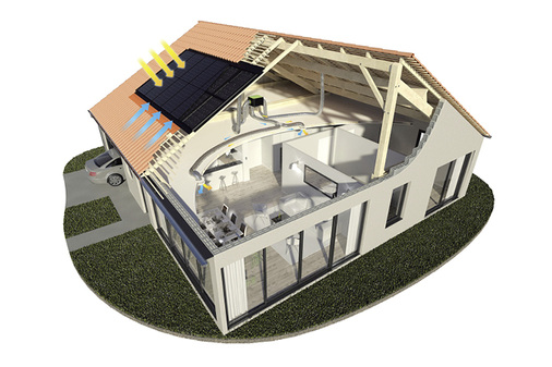 Der französische Hersteller Systovi präsentiert eine sogenannte Aerovoltaikanlage. Um entweichende Abwärme zu nutzen, entwickelte das Unternehmen das Modul R-Volt. Die Besonderheit: Das System nutzt beide Seiten der Solarmodule. Auf der Vorderseite wird der Solarstrom erzeugt, und auf der Rückseite sammelt eine spezielle Ummantelung die warme Luft und leitet sie in die Wohnräume weiter. Dabei lässt sich die Temperatur regeln: In lauen Sommernächten werde die Luft unter den Sonnenkollektoren gekühlt, im Winter werden die Wohnräume geheizt. Während das Modul bestenfalls 20 Prozent der aufgenommenen Sonnenenergie in Strom umwandelt, transformiert es 60 Prozent der aufgenommenen Sonnenenergie zu Wärme. R-Volt sorgt so mit einem einzigen Modul für eine effiziente Stromerzeugung, Heizung durch Warmluft, Belüftung und sogar nächtliche Klimatisierung. Jedes Modul erzeugt 700 Watt. Davon 250 Watt elektrisch und 450 Watt thermisch. Die thermischen Leistungen sind mit dem Solar Keymark-Label zertifiziert.