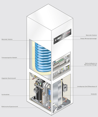 Die Kompakt-Sole-Wasser-Wärmepumpe bis elf Kilowatt von Weishaupt erreicht einen COP von bis zu 5,0 (B0/W35 nach EN 14 511). Die anschlussfertige Einheit beinhaltet die wichtigsten Komponenten des Kälte-, Heiz- und Solekreislaufs, einen 170-Liter-Trinkwarmwasserspeicher und einen Elektro-Heizstab. Das Kältemodul kann für die Einbringung herausgenommen werden, die elektrischen Leitungen haben Steckverbindungen. Die Wärmepumpe bietet die Möglichkeit, passiv über die Fußboden- oder Wandheizung oder dynamisch über Gebläsekonvektoren zu kühlen. Der integrierte Wärmepumpenmanager regelt und überwacht die komplette Anlage. Smart-Grid-ready kann die Wärmepumpe günstigen Strom zur Wärmebevorratung nutzen.