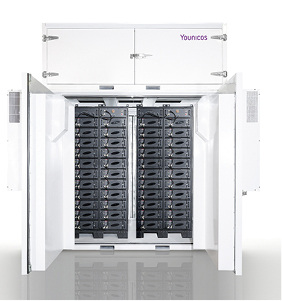 Der Y-Cube der Berliner Firma Younicos besteht aus zwei getrennten Umhausungen: Im oberen Schrank können bis zu zwei Y-Converter zu je 250 Kilowatt untergebracht werden. Im unteren Schrank finden Batterien mit einer Kapazität von bis zu 880 Kilowattstunden Platz. Je nach Anwendung werden unterschiedliche am Markt verfügbare Batteriezellen und -typen installiert. Das Wärmemanagementsystem des Y-Cube kühlt die Batterien so, dass die Lebensdauer optimiert und der Blindverlust reduziert werden. Der Y-Cube leistet einzeln bis zu 500 Kilowatt oder kombiniert sogar mehrere Megawatt. Die einzelnen Schränke werden ohne großen Aufwand nur mithilfe eines Gabelstaplers installiert.