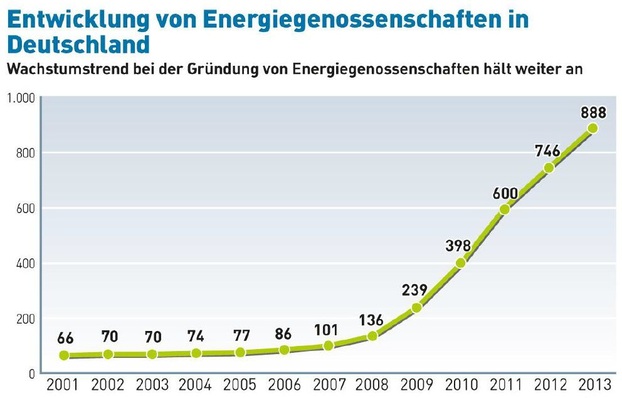 Energiegenossenschaften erleben weiter Zulauf. 888 Energiegenossenschaften engagieren sich in Deutschland für die Energiewende. Das bedeutet einen Zuwachs von rund 19 Prozent im vergangenen Jahr.