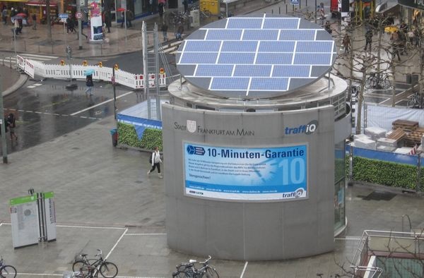 18 Photovoltaik-Module von Evergreen Solar befinden sich auf der ersten Solartankstelle in Frankfurt am Main. Besitzer von Elektromobilen können ihre Fahrzeuge dort kostenlos aufladen.