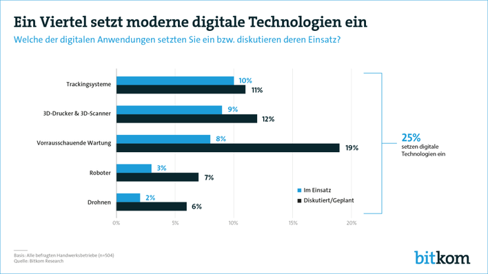Die Digitalisierung ist im Handwerk angekommen: Aktuell verfügen 95 Prozent der Handwerksbetriebe über eine eigene Website, mehr als jeder zweite Betrieb setzt Software für die Steuerung betrieblicher Abläufe ein. Rund ein Viertel nutzt moderne digitale Technologien, zum Beispiel 3D-Drucker zur...