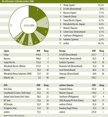 Vorerst macht wohl keine Nation den Japanern ihren Titel als Weltmeister der Zellproduktion streitig. Japans Zellhersteller planen weiteren Ausbau ihrer Kapazitäten, doch Kritiker warnen vor überzogenen Erwartungen. 2006 waren noch drei japanische Unternehmen in den Top Five vertreten, doch Q-Cells und Suntech könnten dem Marktführer seine Position streitig machen. 2010 will Sharp die Fertigung in seiner ersten Gigawatt-Produktion aufnehmen.
