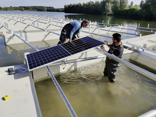 Rheinland Solar hat auf dem See eines Kieswerks in Vorselaer bei Weeze im Juli rund 750 Kilowatt Solarmodule errichtet. Der Clou: 1.872 Solarmodule wurden innerhalb von nur vier Wochen installiert. Die stählerne Unterkonstruktion mit Schwimmkörpern wurde speziell für solche Projekte entwickelt.
